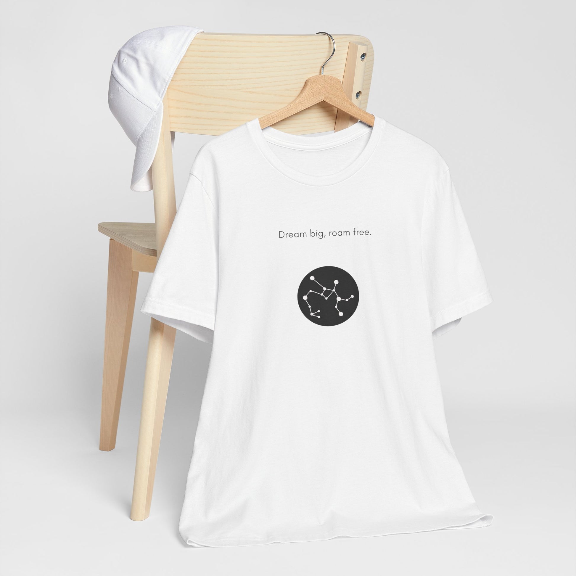 Capture the adventurous spirit of Sagittarius with this inspiring tee. Featuring the Sagittarius zodiac constellation beneath the motivational phrase Dream Big, Roam Free, it’s perfect for free-spirited souls who chase their dreams across the stars.