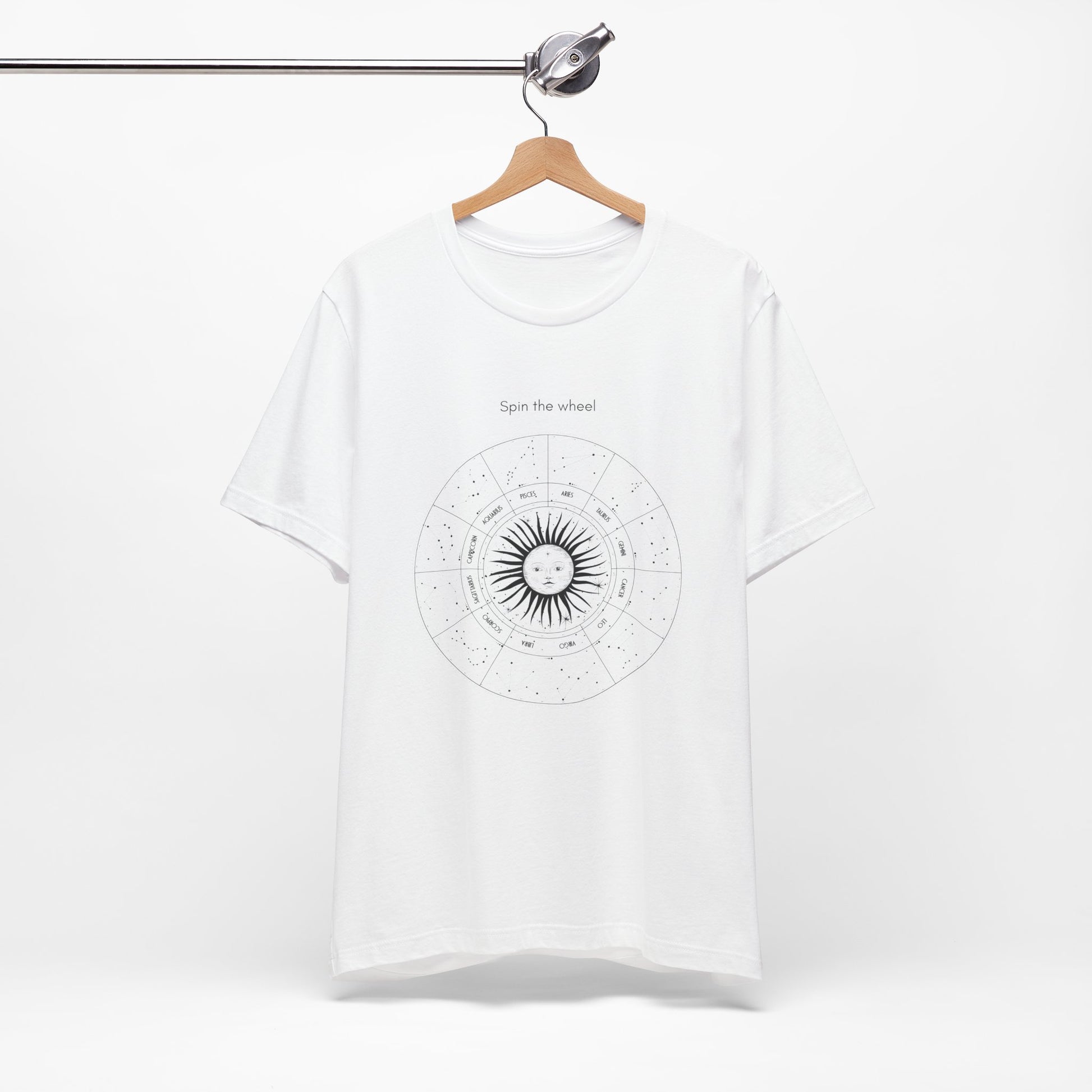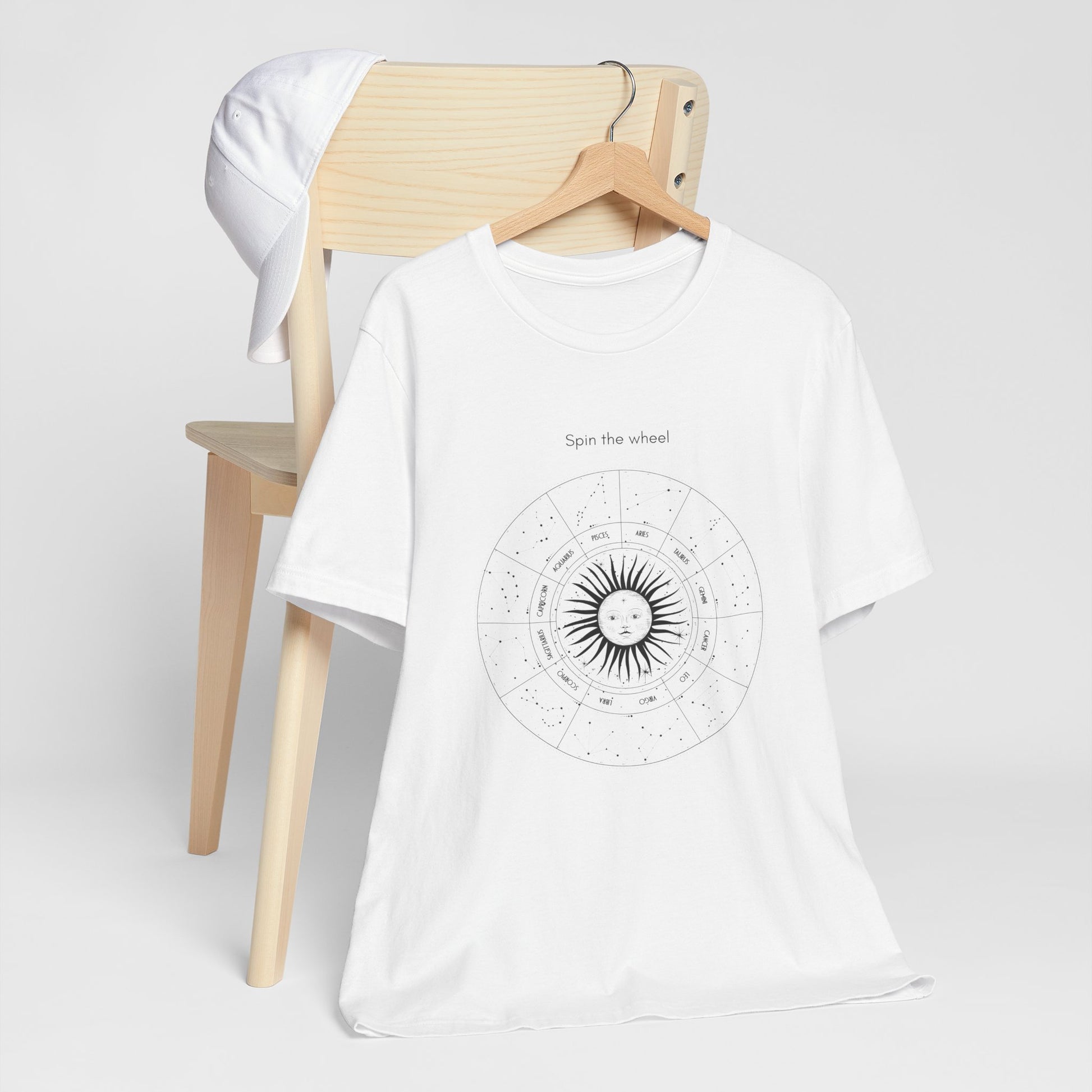This playful tee features a zodiac wheel inviting you to Spin the Wheel of the stars. Perfect for astrology lovers, horoscope fans, and anyone who likes to let fate decide. Embrace your star sign or spin your fate with this fun and stylish astrology tee!
